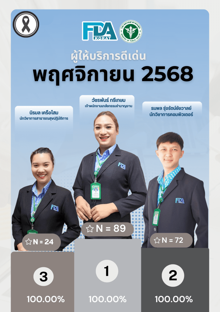 | ข้อมูลอัพเดต : 30 พฤศจิกายน 2568 ที่มา : กลุ่มงานคุ้มครองผู้บริโภคและเภสัชสาธารณสุข สำนักงานสาธารณสุขจังหวัดนครราชสีมา |