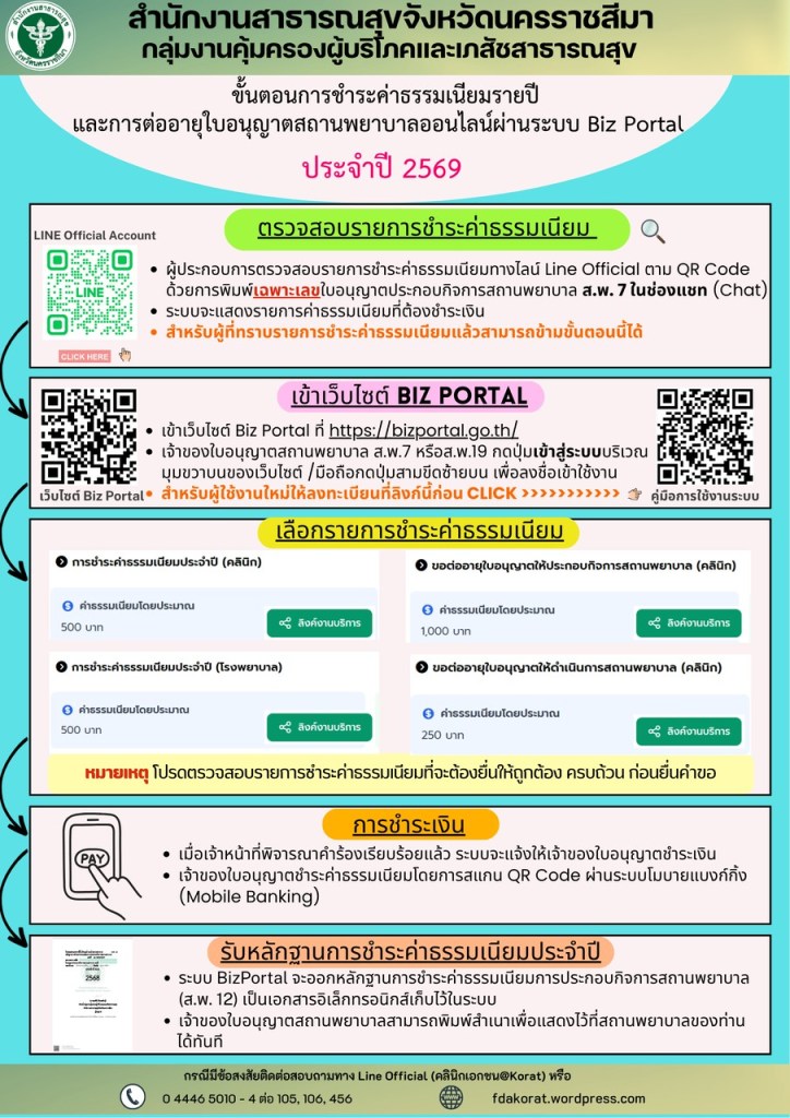 3. ยื่นคำขอต่ออายุใบอนุญาตประกอบกิจการสถานพยาบาล พร้อมแนบเอกสารหลักฐานให้ครบถ้วน ติดต่อยื่นคำขอต่ออายุได้ที่ “ศูนย์บริการผลิตภัณฑ์สุขภาพเบ็ดเสร็จ กลุ่มงานคุ้มครองผู้บริโภคฯ สำนักงานสาธารณสุขจังหวัดนครราชสีมา”