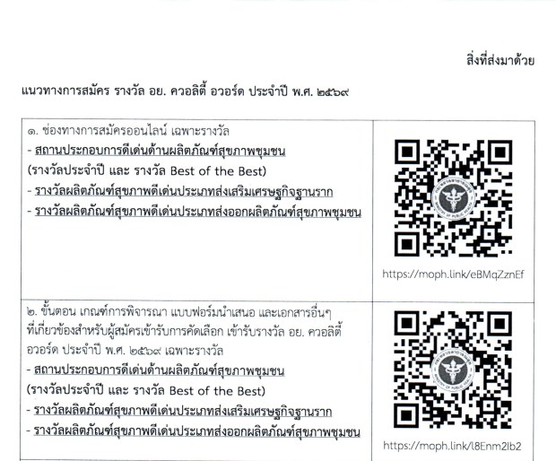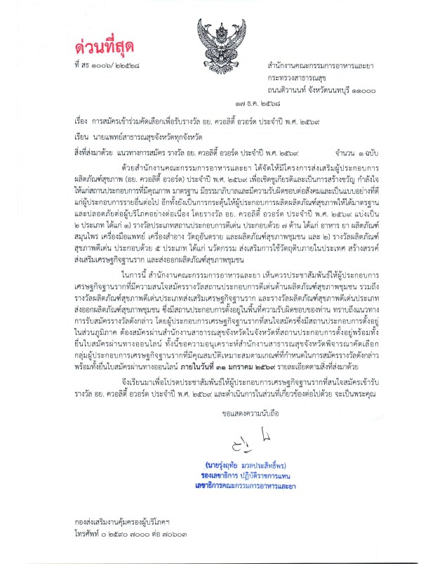ในการนี้ เห็นควรแจ้งแนวทางการรับสมัคร และเกณฑ์คัดเลือกผู้รับรางวัล อย. ควอลิตี้ อวอร์ด ประจำปี 2569